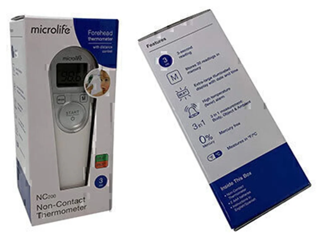 تب سنج دیجیتال میکرولایف مدل NC200 تب سنج های غیر تماسی مایکرولایف برای اندازه گیری سریع، قابل اطمینان و بهداشتی از طریق پیشانی در مدت کوتاه 3 ثانیه طراحی شده اند.اندازه گیری به طور خودکار با سنسور تشخیص فاصلهتب سنج غیر تماسی مایکرولایف به هنگام تشخیص فاصله 5 سانتی متری از پیشانی شروع به اندازه گیری به صورت خودکار می نماید