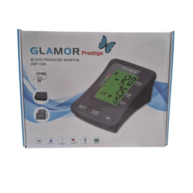 فشارسنج گلامور مدل DBP-1305 یک فشارسنج سخنگو از سری فشارسنج های شرکت گلامور است. این دستگاه با طراحی خاص خود می تواند در بسیاری از موقعیت ها برای اندازه گیری فشار خون بکار رود. از ویژگی های این دستگاه می توان به حافظه و همچنین دو کاربره بودن آن اشاره کرد و همینطور نور پشت صفحه این دستگاه به خوانش راحت تر در محیط های تاریک کمک شایان توجهی می نماید. این دستگاه قابلیت تشخیص آریتمی قلب یا همان ظربان نامنظم قلب را داشته و می تواند به روند درمان این بیماری کمک کند.